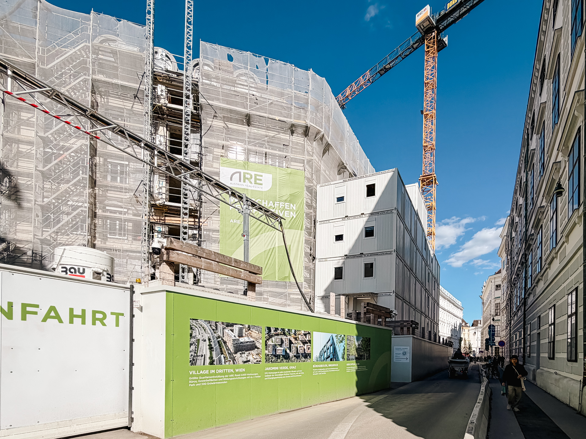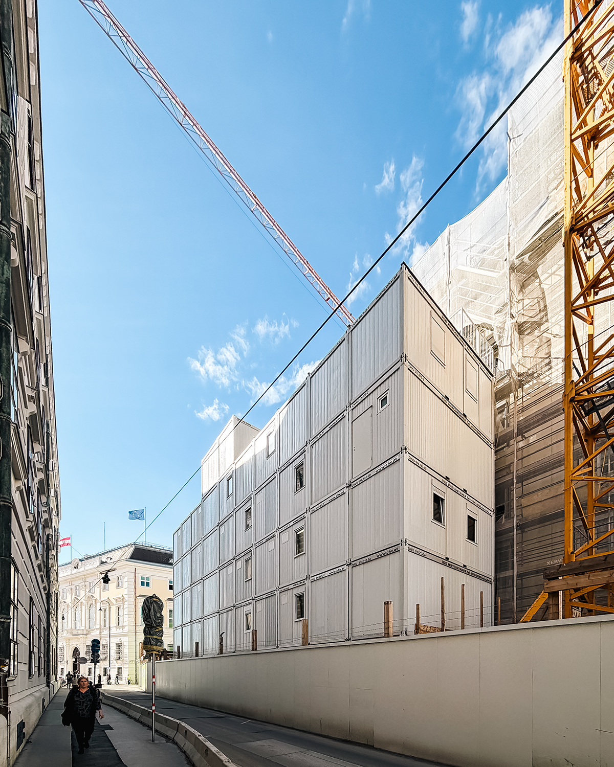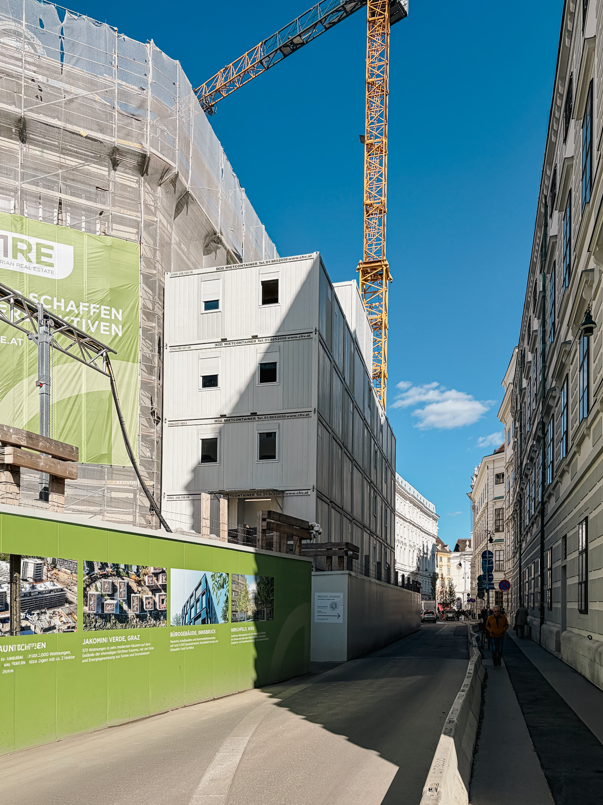 A particularly striking part of the project is the multi-storey container office installation at the rear of the site along Schauflergasse. The structure was built across five levels and extended up to a sixth floor, creating substantial office capacity on a very limited footprint exactly where it was needed for daily construction operations.
