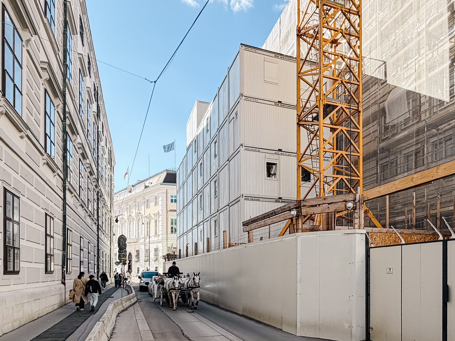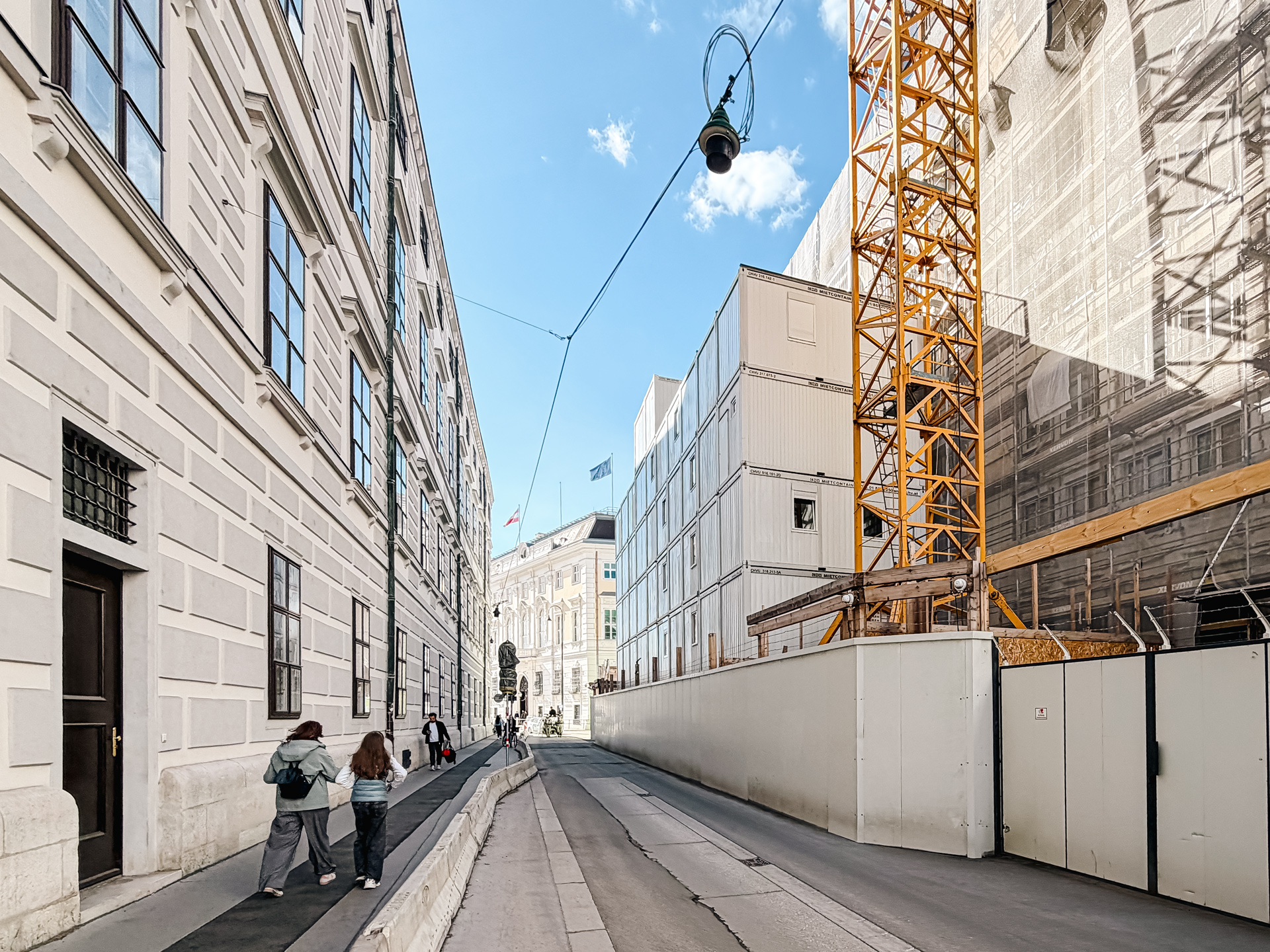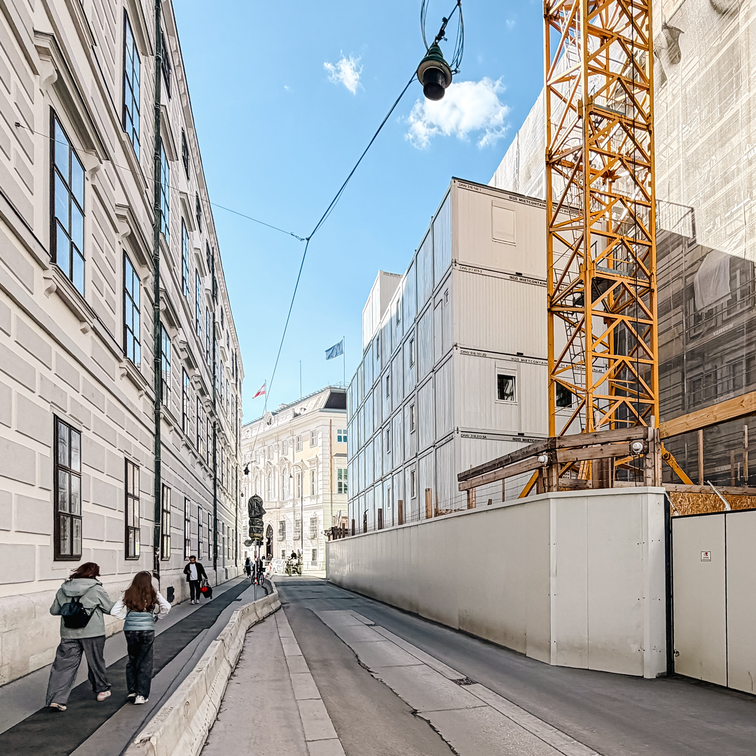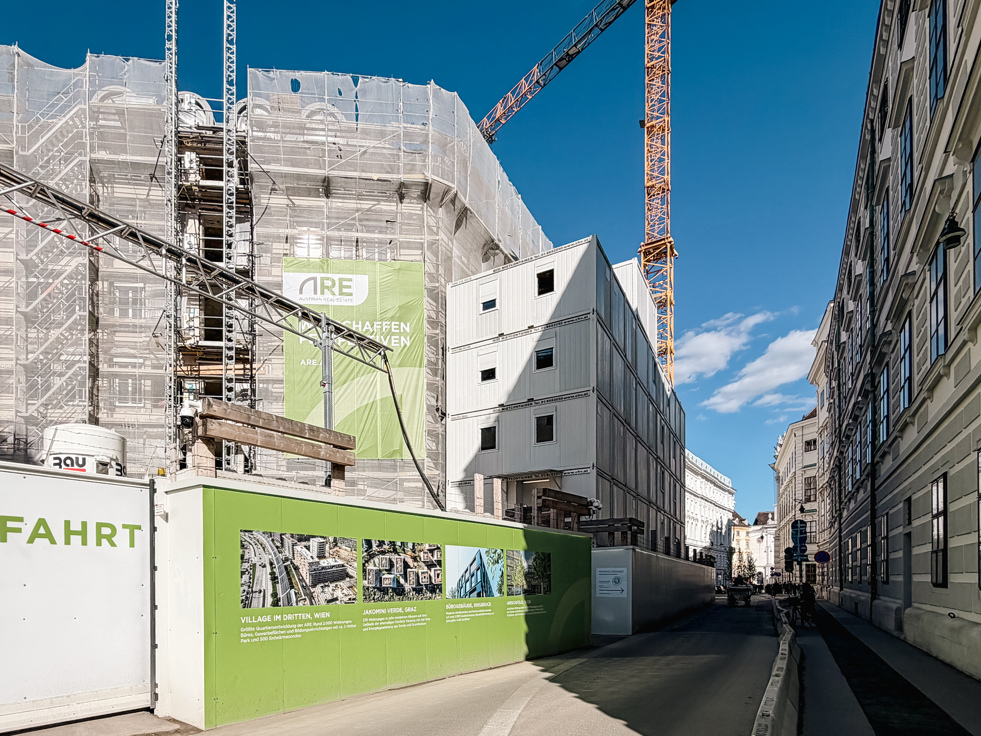 A particularly striking part of the project is the multi-storey container office installation at the rear of the site along Schauflergasse. The structure was built across five levels and extended up to a sixth floor, creating substantial office capacity on a very limited footprint exactly where it was needed for daily construction operations.
