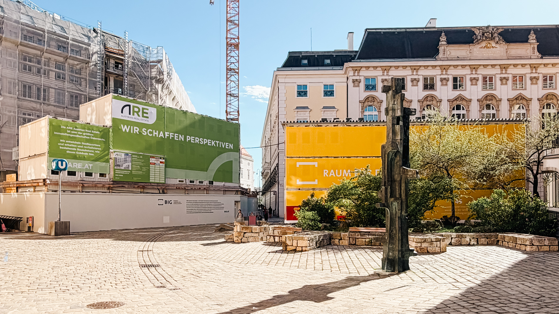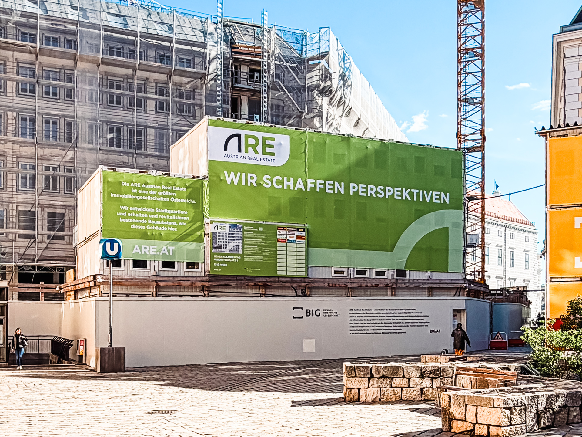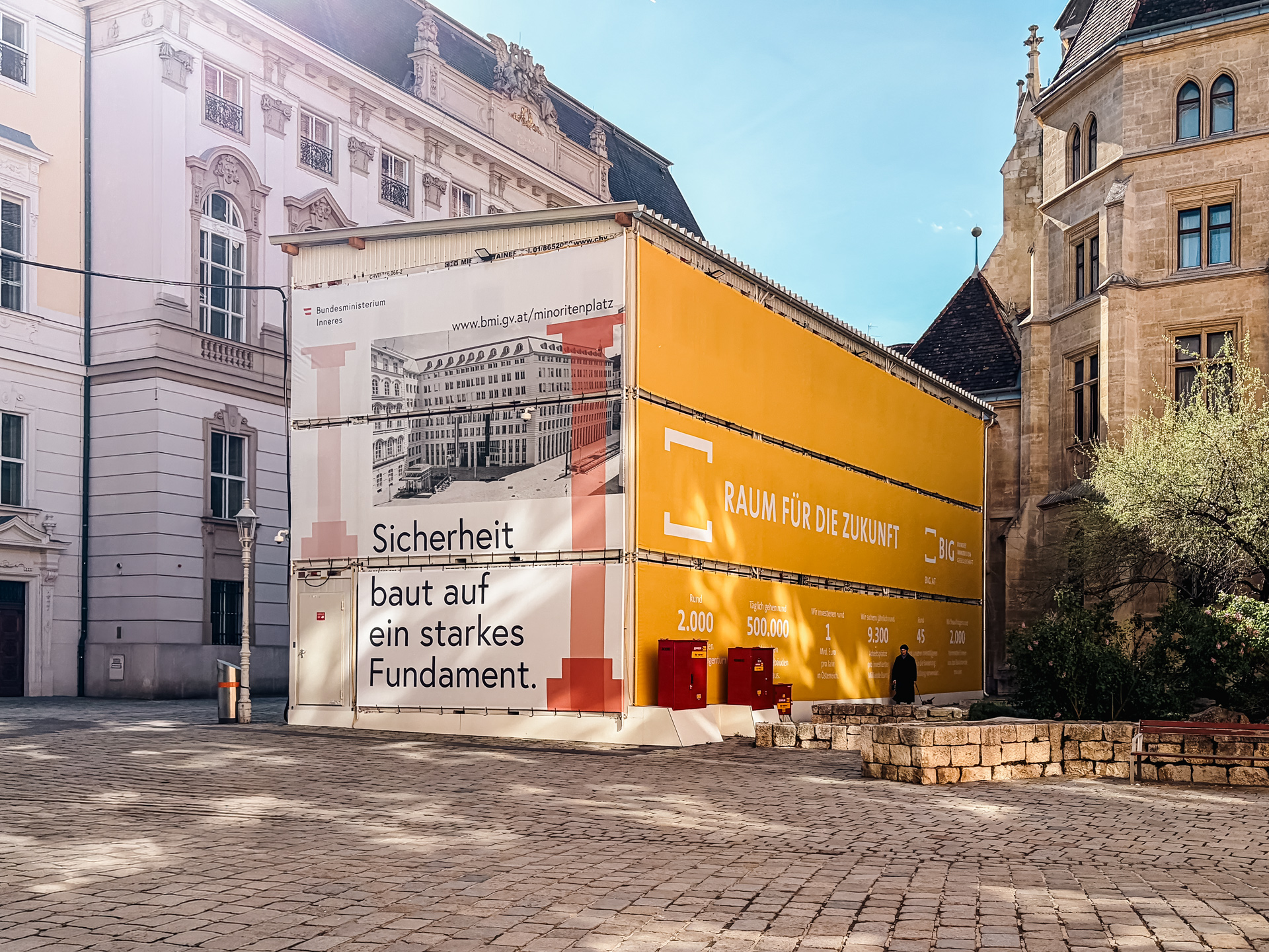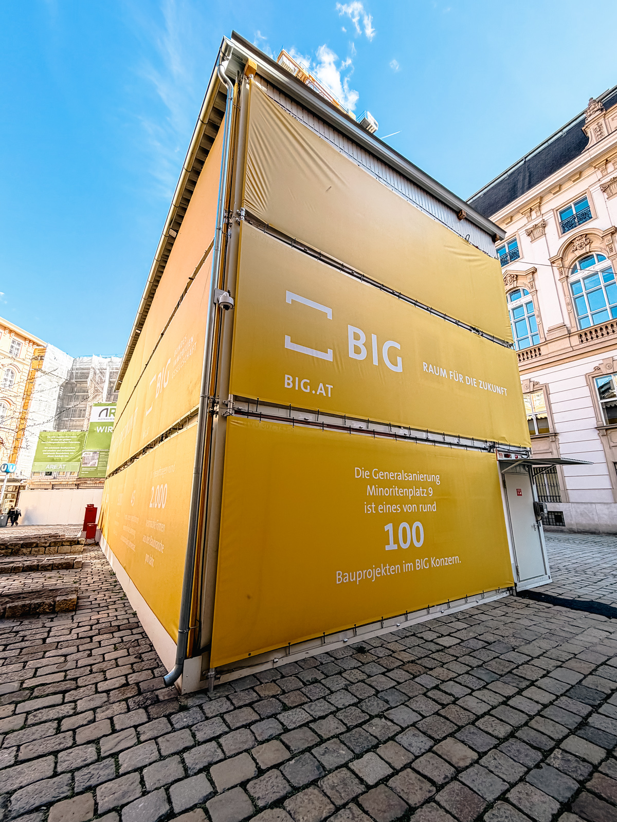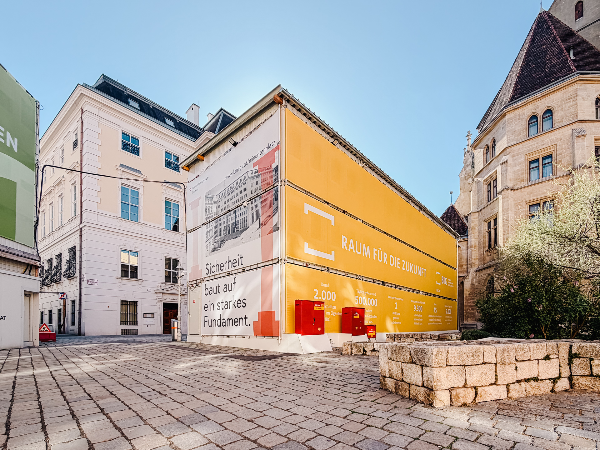 The temporary site office for BIG was installed directly at Minoritenplatz, forming the visible front-facing part of the site organisation. Within the construction area itself, two further multi-storey site office installations were built for ARE Austrian Real Estate, creating additional office capacity in close proximity to the works. The result is a clearly structured working environment with short internal distances and a reliable infrastructure that supports day-to-day construction operations.