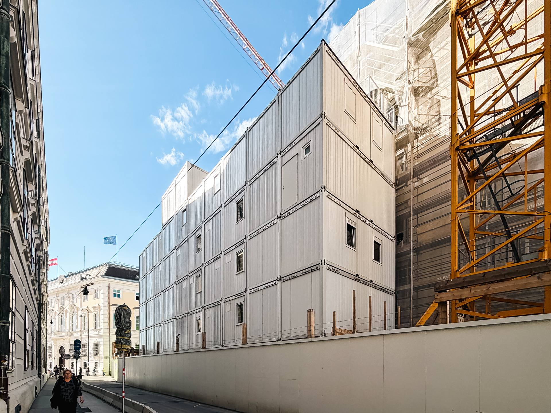 In the heart of Vienna’s 1st district, CHV created a demanding temporary office infrastructure for the major refurbishment project at Minoritenplatz 9. For the duration of the construction works, three separate multi-storey container installations were erected to serve as site offices and as the organisational centre of the project.