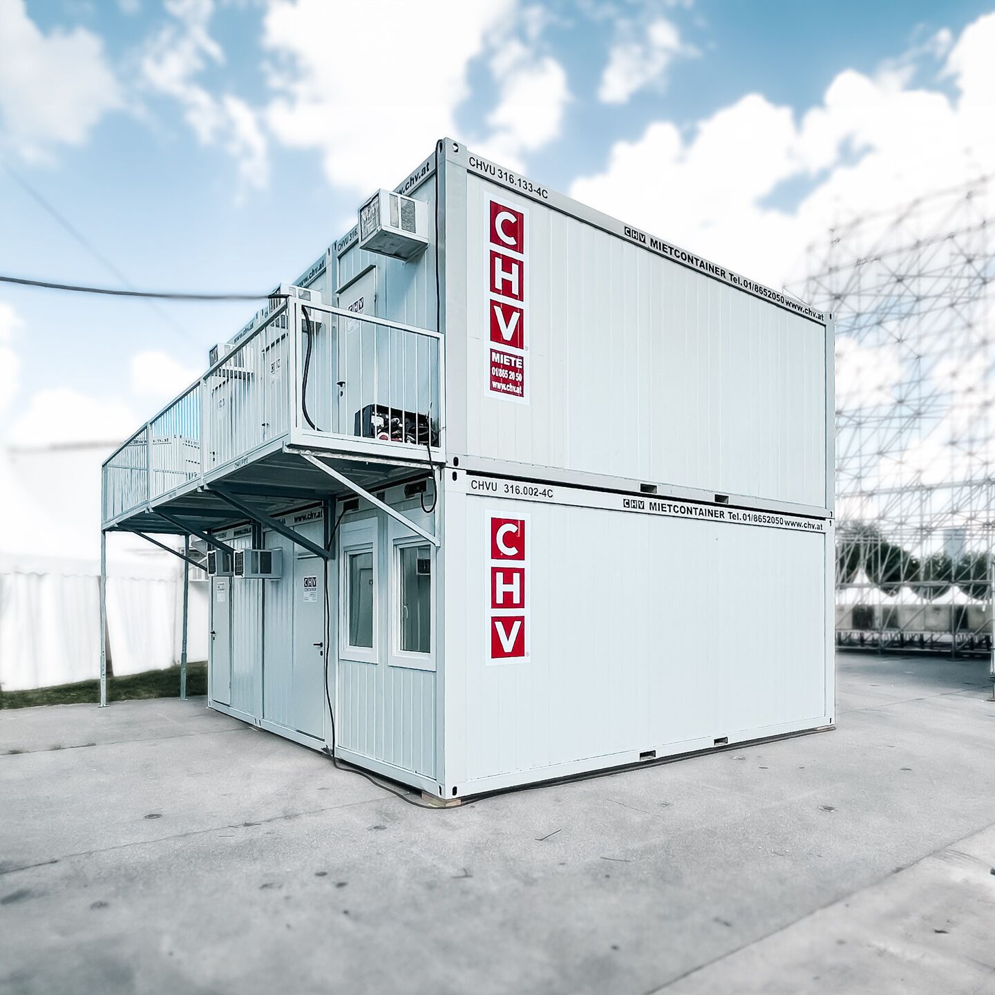 Das nachfolgend beschriebene Treppensystem eignet sich für den 2-stöckigen Aufbau von 2 bis 4 Bürocontainern. Die Türöffnung des oberen Containers ist dabei auf der Stirnseite.
