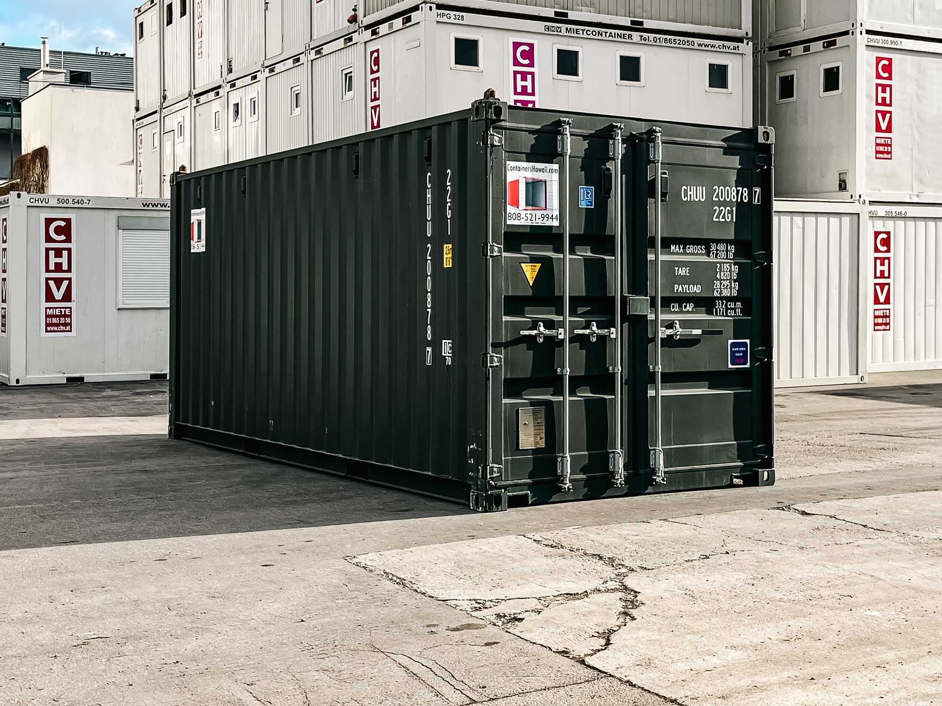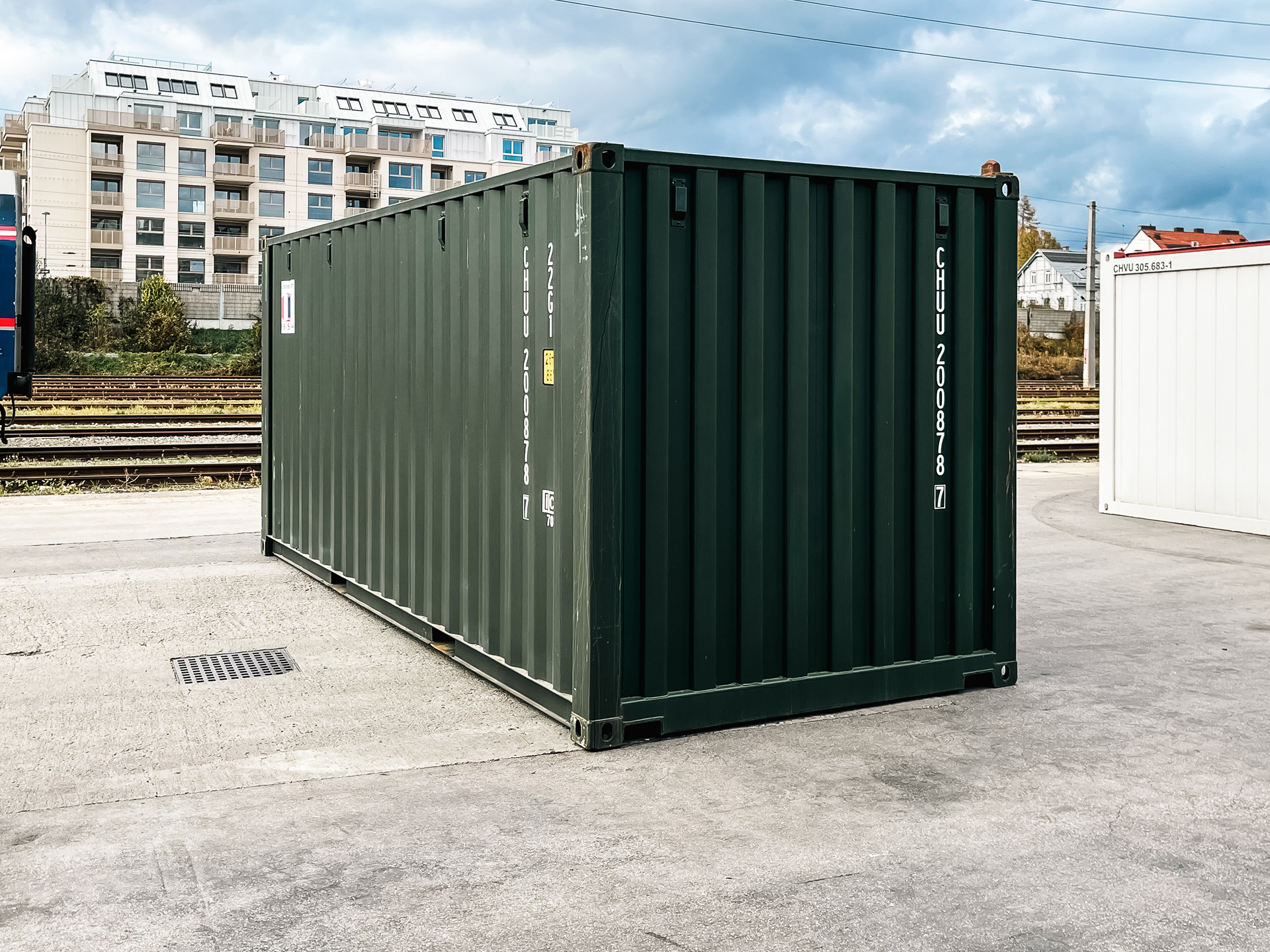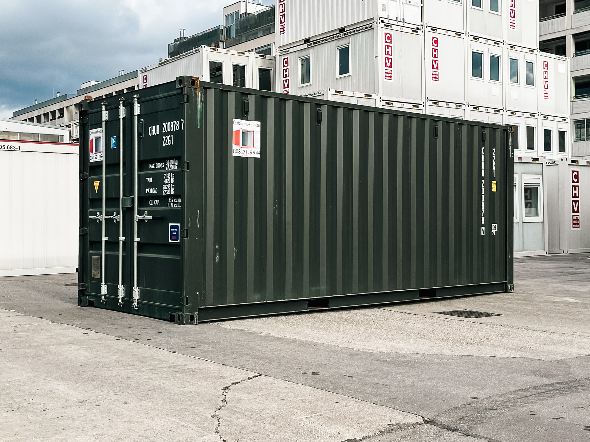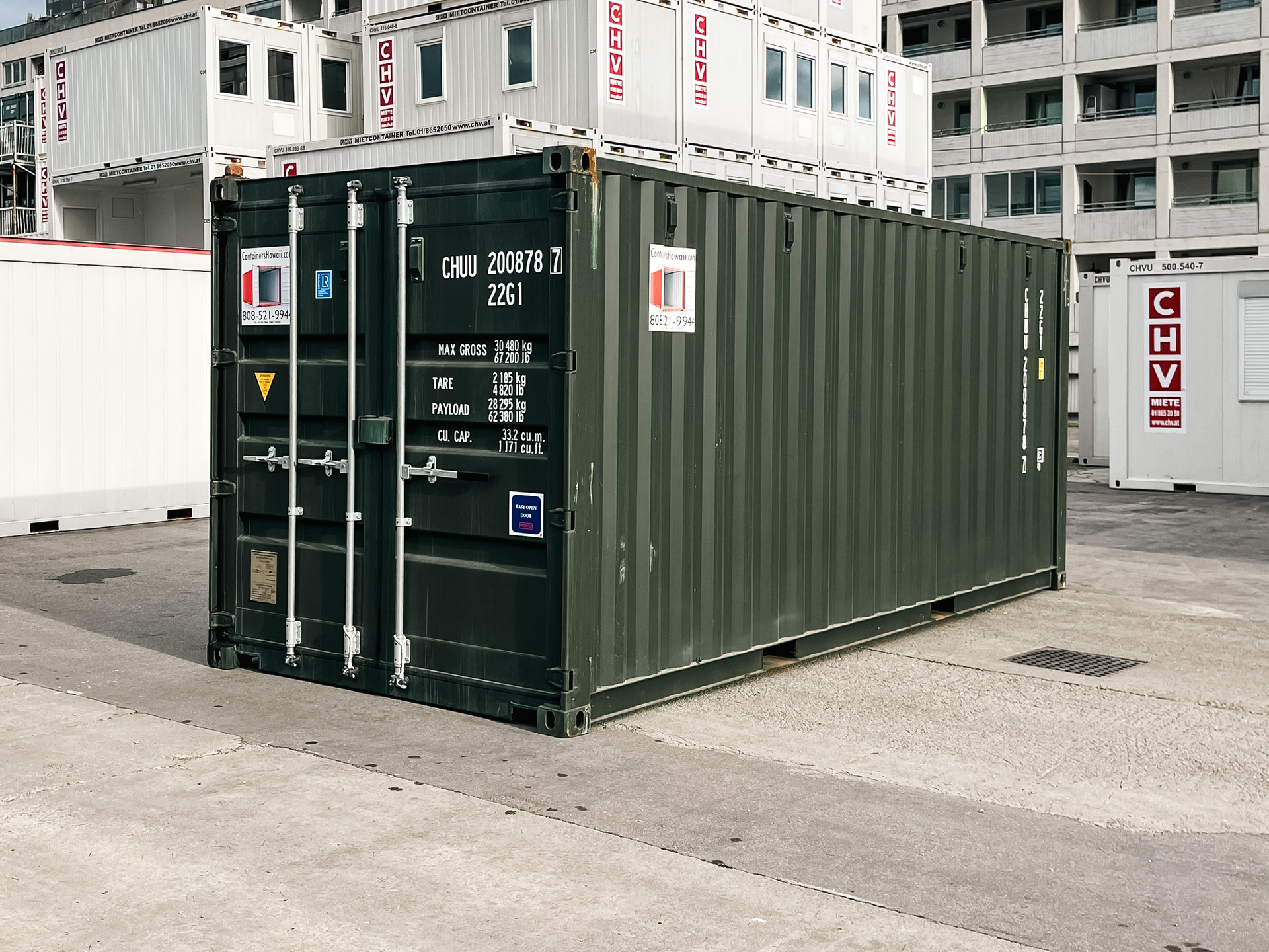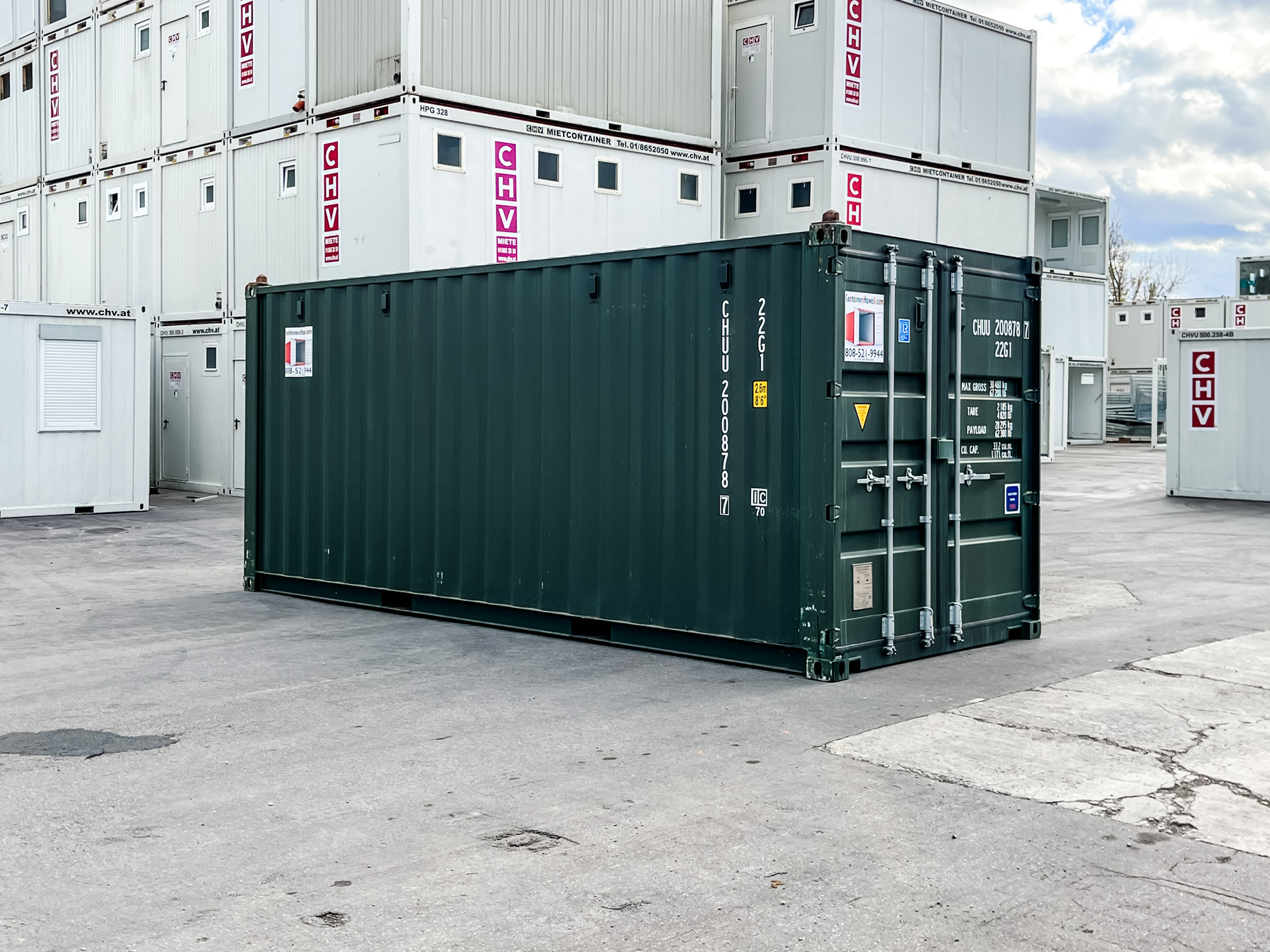 Gebrauchter Schiffscontainer 20 Fuß | 6 Meter aus Cortenstahl, ISO normiert mit gültiger CSC Plakette und dunkelgrüner Lackierung ab Depot Wien sofort erhältlich.