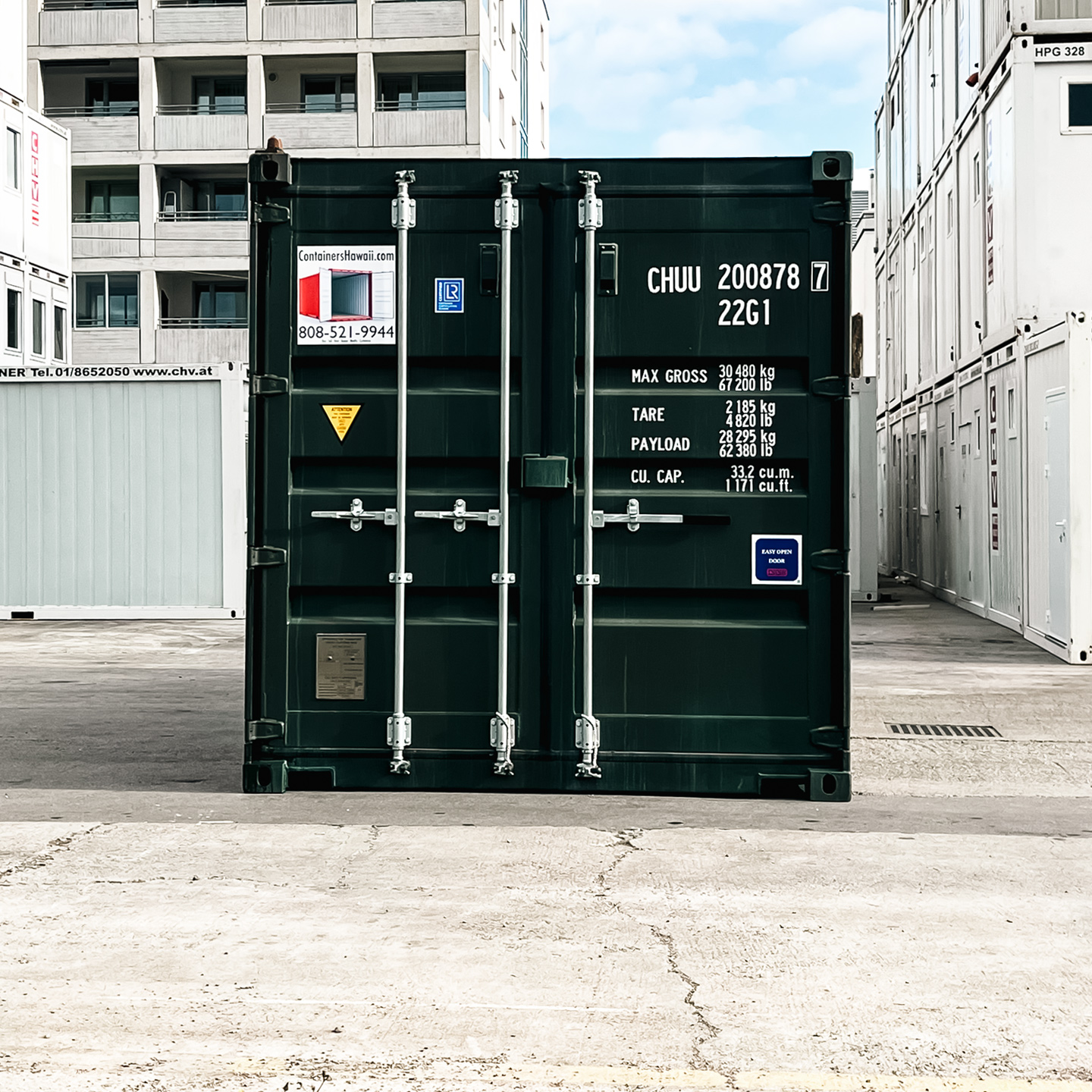 Gebrauchter Schiffscontainer 20 Fuß in Dunkelgrün mit 3-Stangen Easy-Open Verriegelungsmechanik und CSC-Plakette in Top-Zustand ab Lager sofort verfügbar.