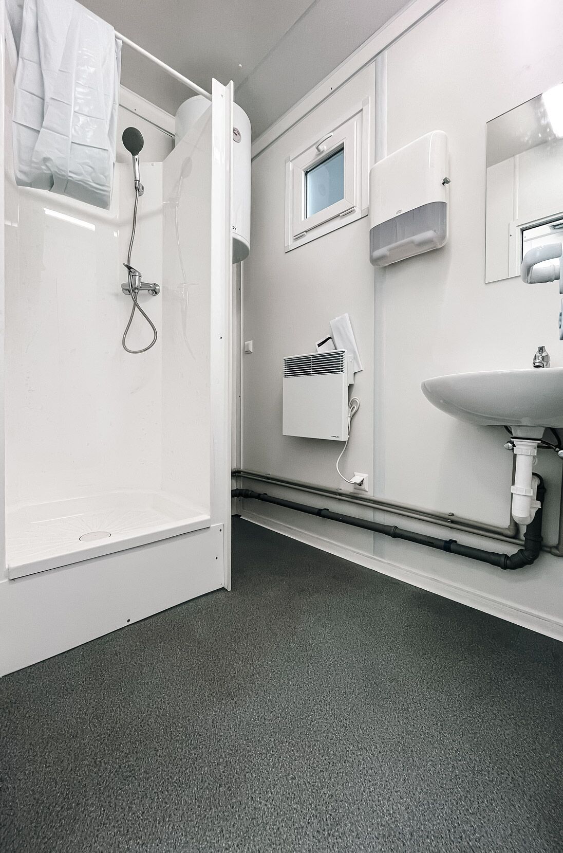 Dank seiner robusten Konstruktion und kompakten Größe ist der Duschcontainer einfach zu transportieren und schnell einsatzbereit. Die Standardausstattung kann durch zusätzliche Features wie individuelle Innenverkleidungen und technische Anpassungen erweitert werden, um eine maßgeschneiderte Lösung für Ihre spezifischen Anforderungen zu bieten.