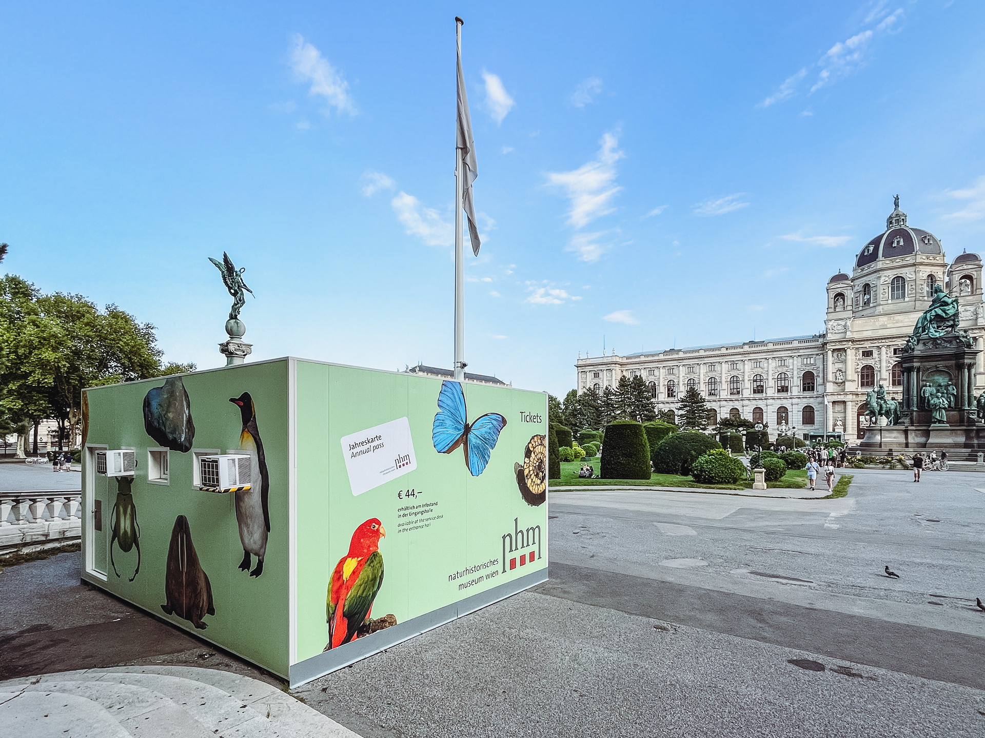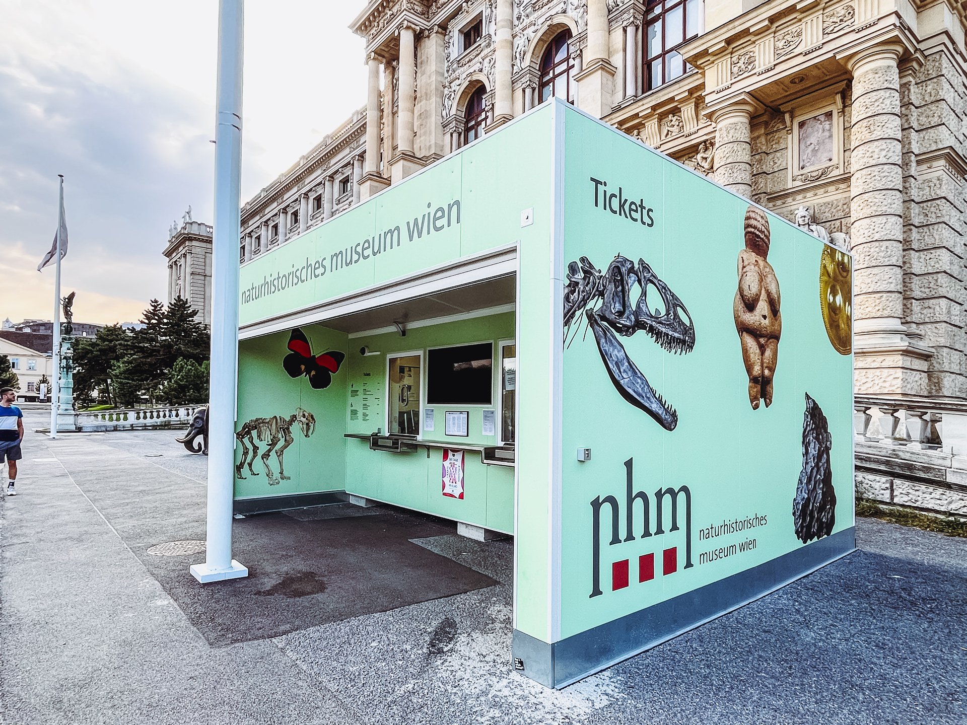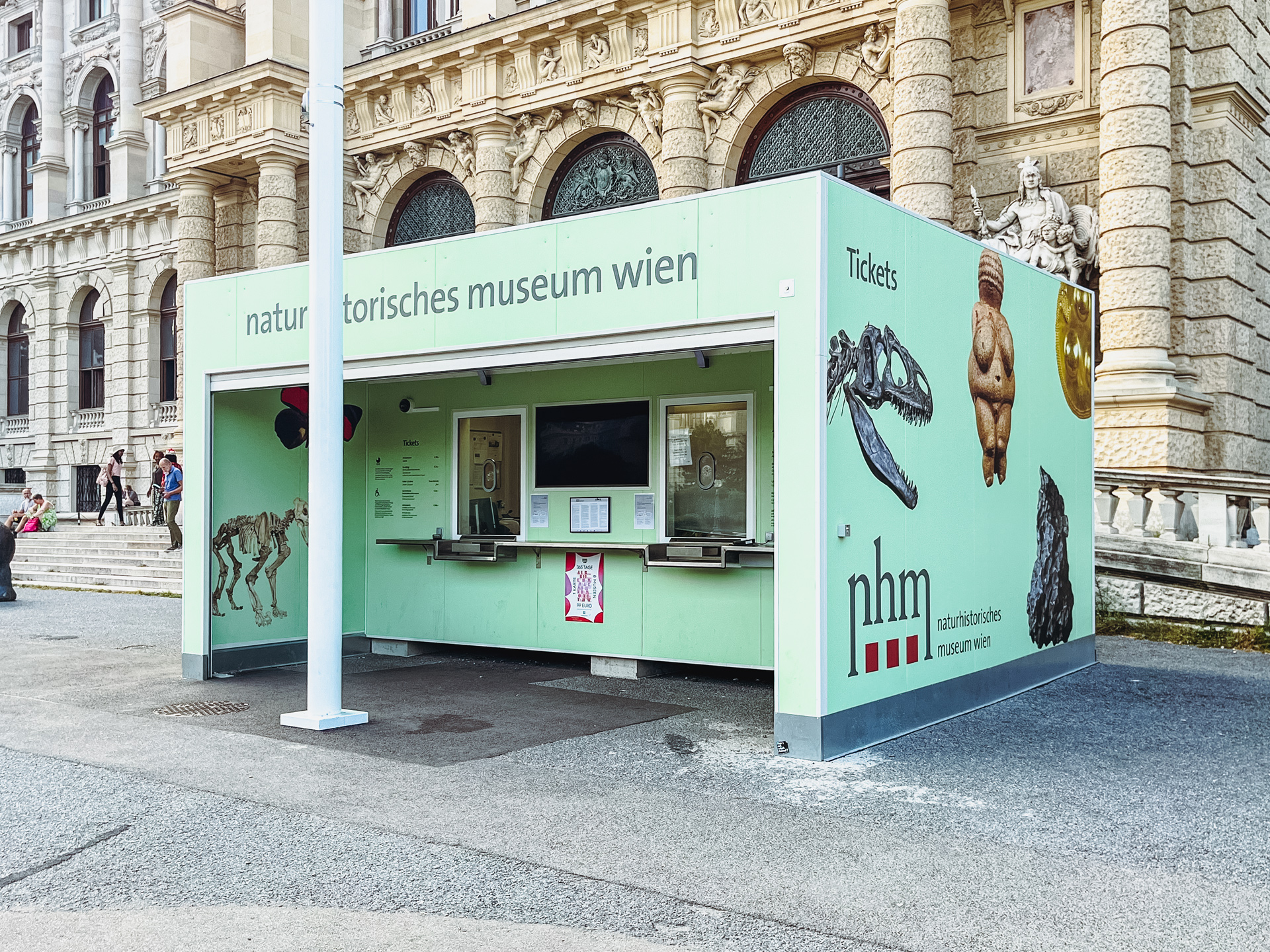 Mitten im historischen Ambiente des Naturhistorischen Museums in Wien präsentiert sich ein innovativer Kassacontainer, der Funktionalität und ansprechendes Design vereint. Dank einer aufwendig gestalteten Außenfolierung, die naturwissenschaftliche Motive wie Insekten und Fossilien zeigt, fügt sich der Container nahtlos in das Museumskonzept ein und weckt schon von außen Neugier bei den Besuchern.